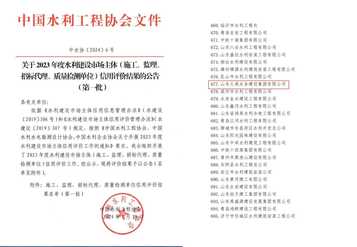 近日,中國水利工程協(xié)會發(fā)布《關(guān)于2023年度水利建設(shè)市場主體信用評價結(jié)果的公告》,山東大禹水務(wù)建設(shè)集團有限公司獲評“2023年度水利建設(shè)市場主體施工信用評價AAA級企業(yè)”。
